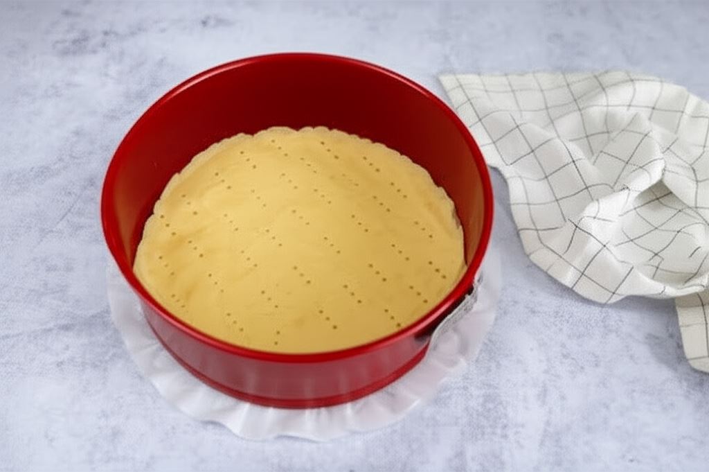 Wyjmij ciasto z lodówki i wyłóż nim dno formy do tarty, pokrytej papierem do pieczenia. Nakłuj ciasto widelcem w kilku miejscach, a potem umieść w piekarniku rozgrzanym do 180 stopni na 20 minut. Pozostaw upieczony spód do ostygnięcia.