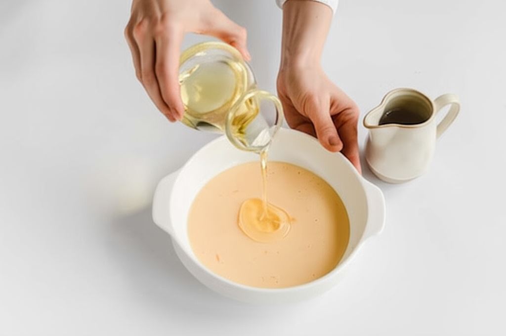 Oddzielamy białka od żółtek. Żółtka mieszamy z cukrem, dopóki nie uzyskamy puszystej i jasnej masy. Dodajemy olej i wodę, po czym dokładnie miksujemy.