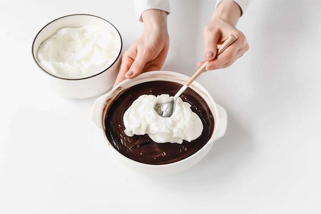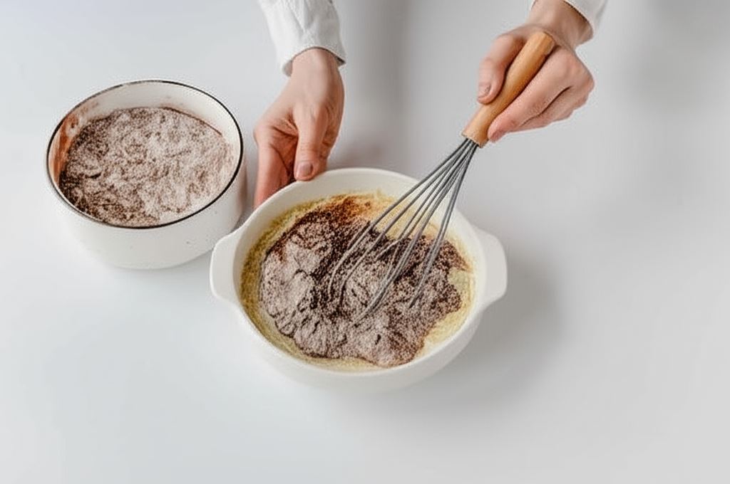 Mąkę z proszkiem do pieczenia przesiewamy do miski. Wsypujemy kakao. Dokładnie mieszamy, aby składniki się połączyły. Mąkę wsypujemy do miski z żółtkami. Mieszamy dokładnie.