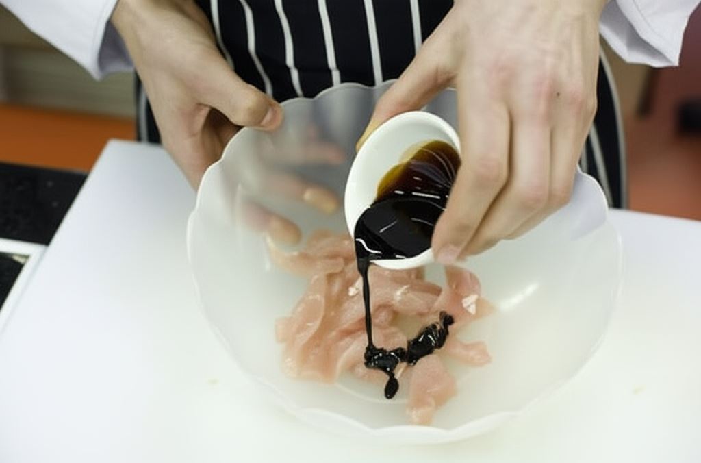 Potnij mięso w paski. Dopraw sosem sojowym, po czym zamieszaj. Odstaw na 30 minut, a następnie odcedź nadmiar sosu.