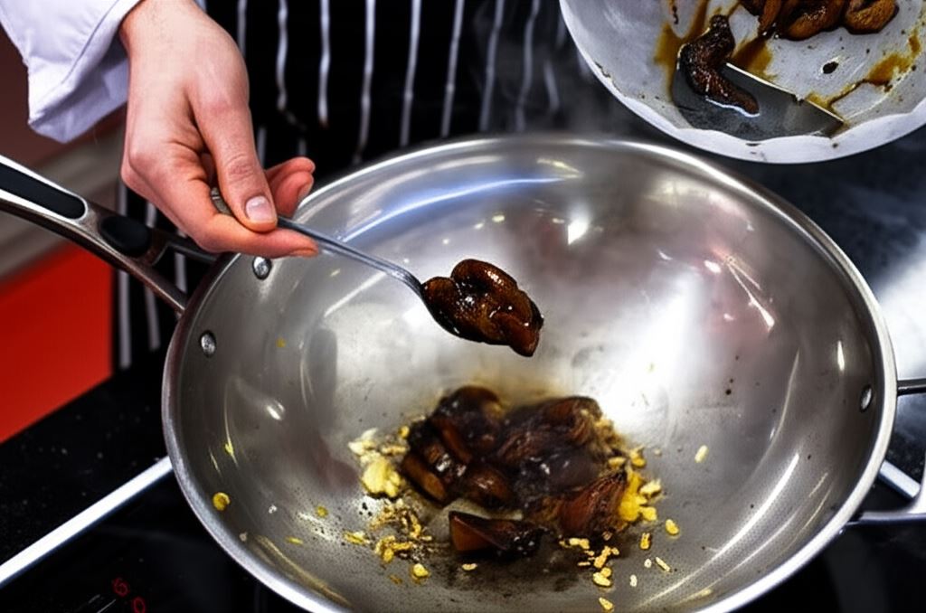Podgrzej w woku łyżkę oleju i podsmaż krótko posiekany czosnek, skórki i imbir, następnie wsyp połowę mięsa.