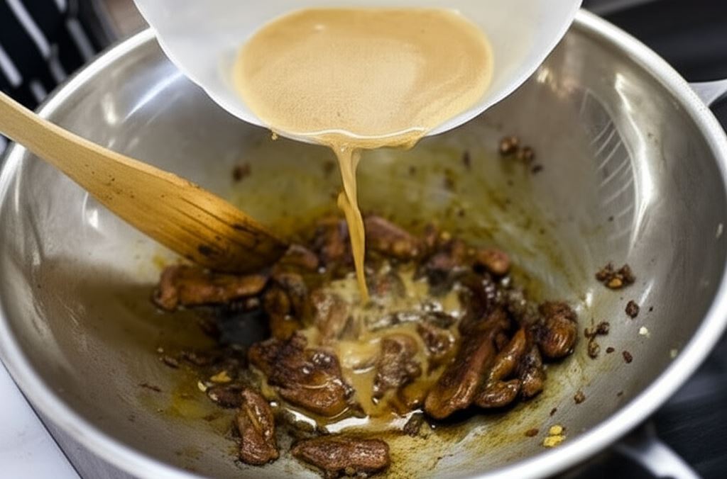 Mieszaj danie aż sos stanie się gęsty. Przenieś całość na talerz, po czym polej olejem sezamowym i obsyp ziarnami sezamu. Podawaj osobno lub razem z ryżem.