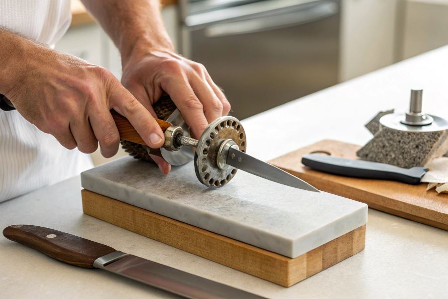 - Dokładne osuszenie – przed ostrzeniem nóż musi być całkowicie suchy, aby uniknąć korozji