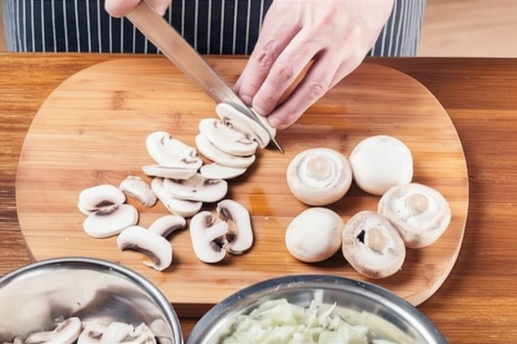 Cebulę oczyść z suchych łusek i posiekaj w piórka. Pieczarki umyj z pozostałości ziemi, a potem pokrój na plastry o jednakowej grubości.