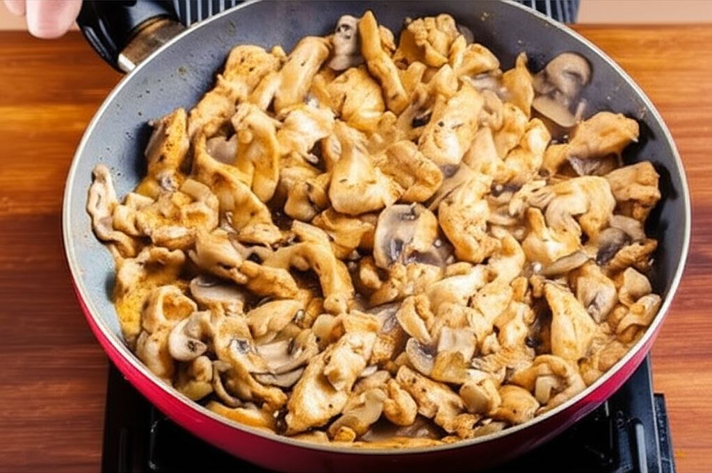 Wlej na patelnię odrobinę oleju i rozpocznij podgrzewanie. Kiedy tłuszcz stanie się gorący, dodaj najpierw mięso, a po chwili dorzuć warzywa. Smaż wszystkie składniki, regularnie mieszając dopóki cały płyn odparuje, a mięso zrobi się złociste i miękkie.