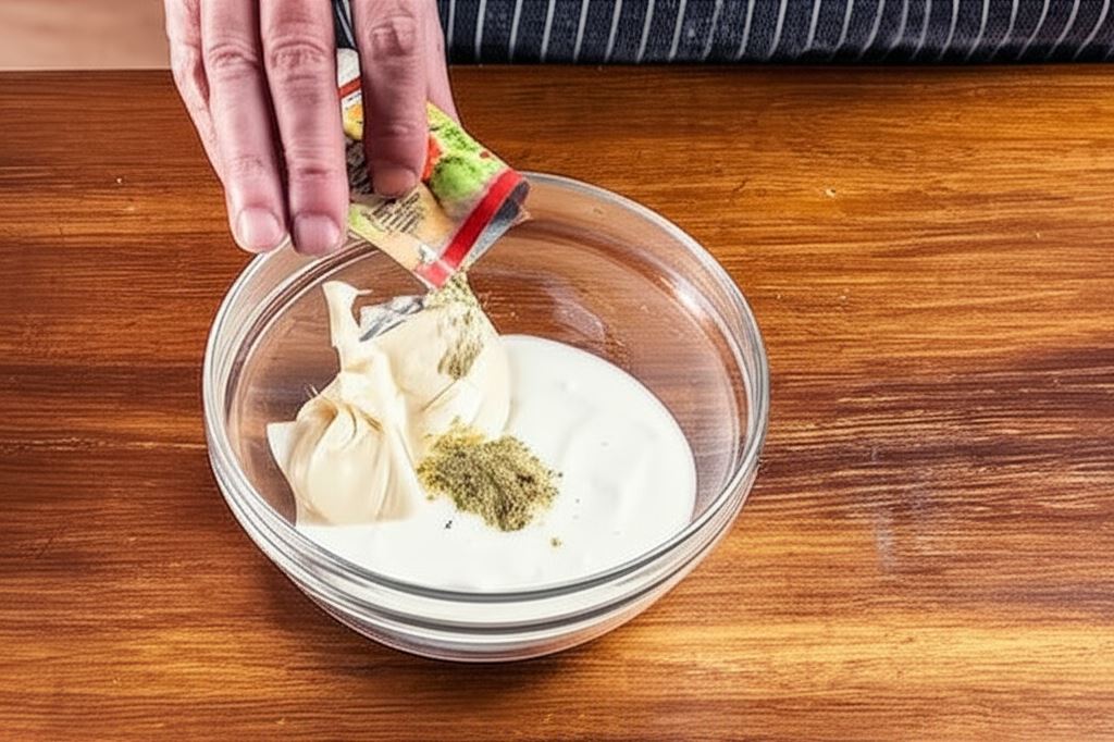 W oddzielnym naczyniu sporządź sos do shoarmy: połącz przeciśnięty ząbek czosnku z majonezem, jogurtem oraz sosem sałatkowym Knorr.
