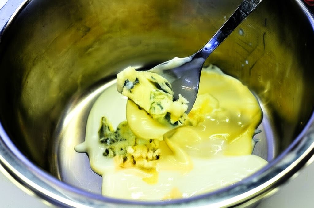 Ser pleśniowy rozdrobnij i połącz z majonezem, jogurtem oraz przeciśniętym czosnkiem. Całość zamieszaj, by otrzymać niezbyt jednolity sos.