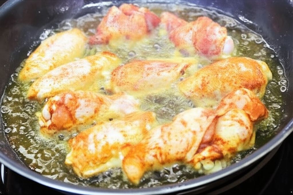 Na rozgrzany olej wkładaj skrzydełka i smaż je przez 5-8 minut, następnie wyjmij i odsącz. Potem dopiecz w piekarniku w temperaturze 180 stopni przez 20 minut.