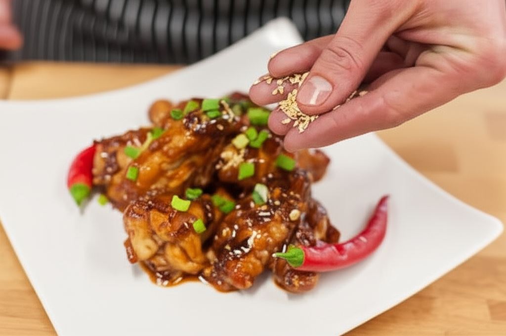 Pod koniec grillowania skrzydełka ponownie zanurz w marynacie, umieść na półmisku i posyp od góry nasionami sezamu.