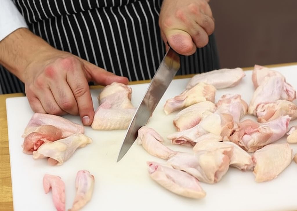 Skrzydełka podziel na części. Końcówki (lotki) odetnij ostrym nożem i odstaw (zachowaj np. do rosołu). Pozostałe skrzydełka przetnij na dwie części i osusz papierowym ręcznikiem.