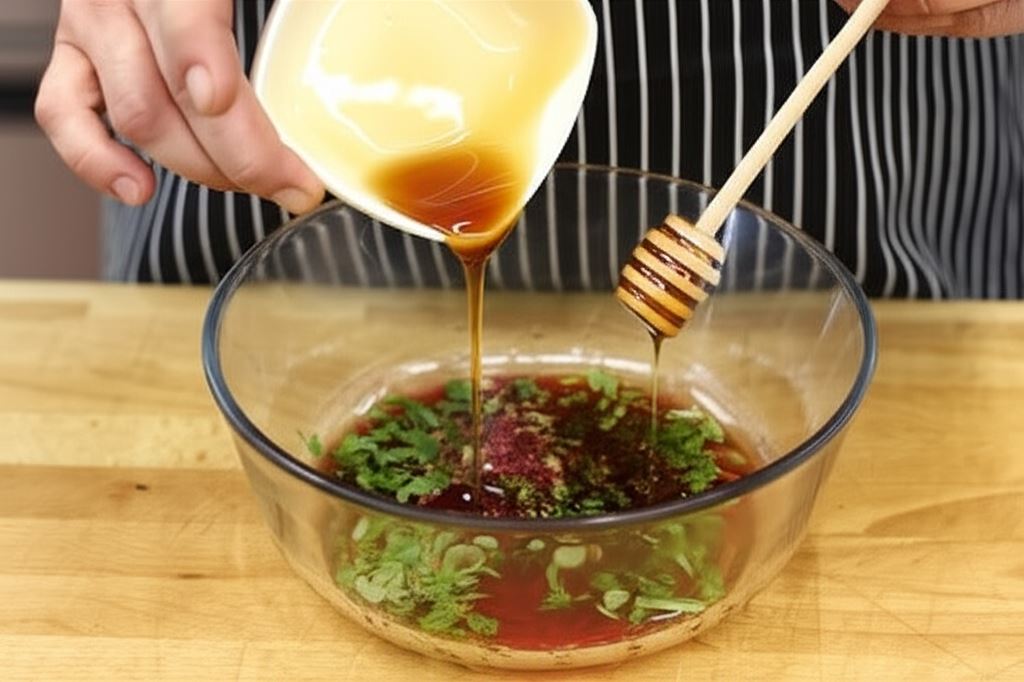 W naczyniu zmieszaj wiśniówkę, oliwę, ocieplony miód, cynamon, płatki chilli i posiekaną kolendrę. Marynatę wymieszaj, a następnie rozdziel na dwie porcje.