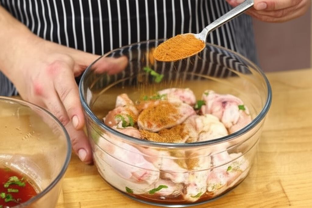 Skrzydełka umieść w misce, obsyp równomiernie przyprawą Knorr, po czym dodaj połowę przygotowanej marynaty i zamieszaj. Pozostaw na 30 minut.