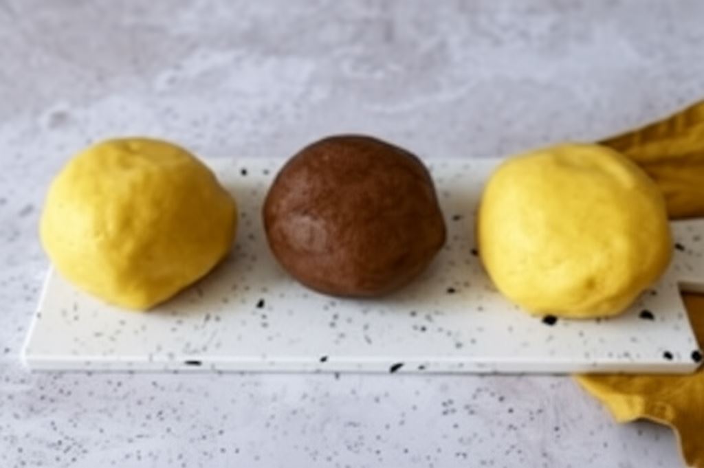 Rozdziel masę na trzy części. Do jednej z nich wsyp kakao. Zagnieć jeszcze raz. Umieść 1 porcję jasnego ciasta w zamrażarce na około 45 minut.