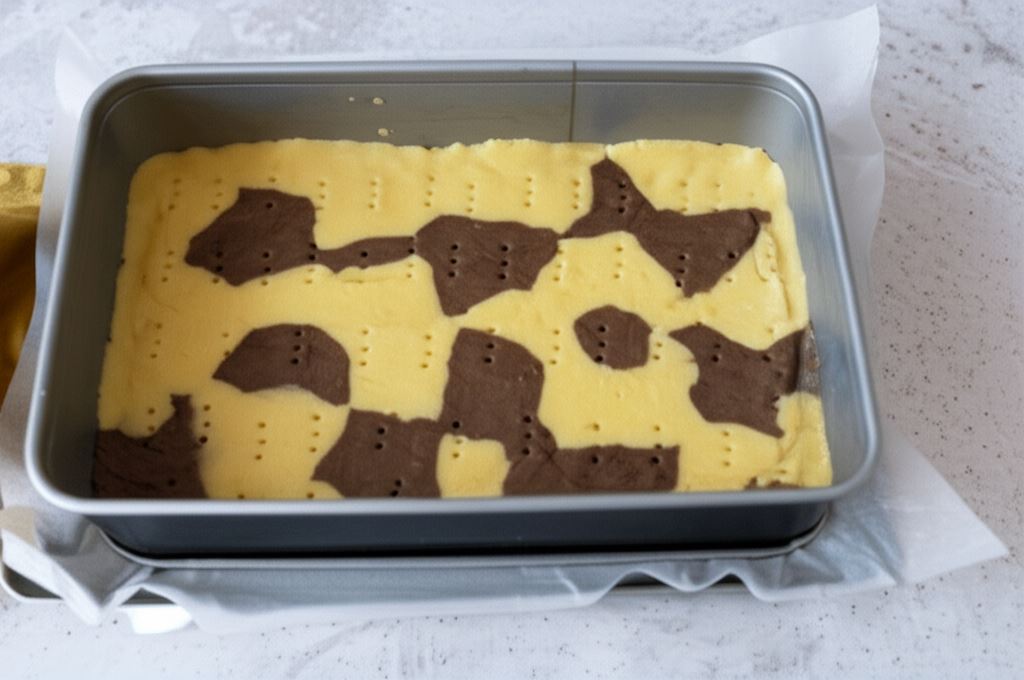 Z dwóch pozostałych części ciasta (jasnego i kakaowego) odrywaj kawałki i układaj na dnie formy, wyścielonej papierem do pieczenia. Wyrównaj np. przy użyciu palców lub niewielkiego wałka. Ponakłuwaj widelcem. Wstaw do piekarnika, rozgrzanego do 180 stopni, na około 15 minut.