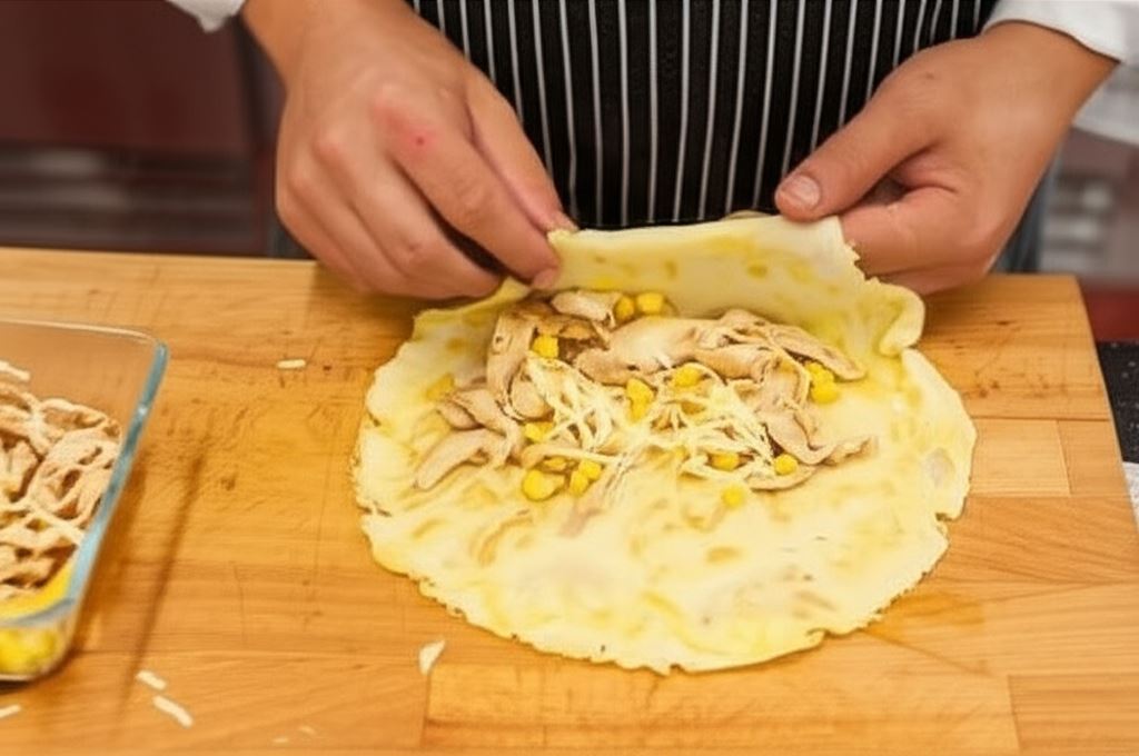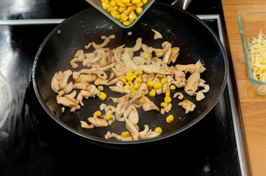 Usmaż kurczaka, wsyp kukurydzę. Gdy trochę przestygnie, połącz z serem.