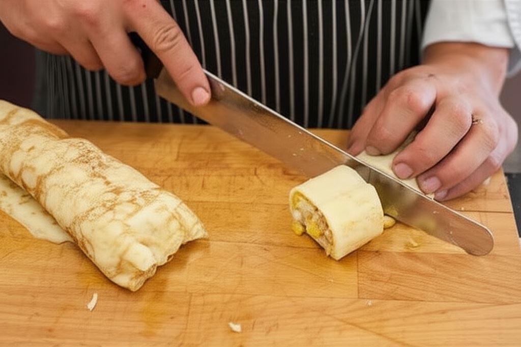 Umieść lekko ciepłe nadzienie na naleśniki i zawiń dokładnie.