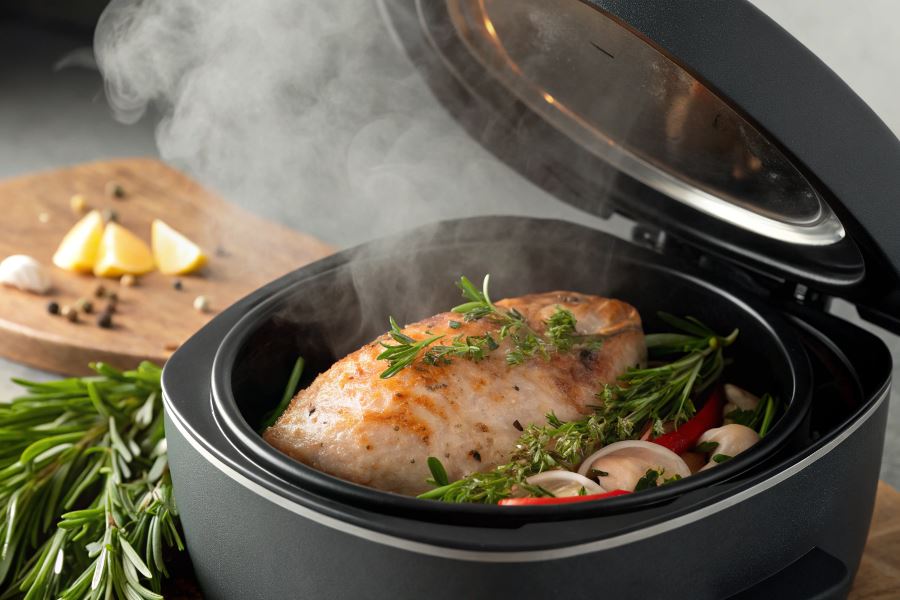 Multicooker działa na zasadzie zamkniętego obiegu pary, co stanowi kluczowy element sukcesu w przygotowaniu idealnie soczystej piersi z kurczaka. W tradycyjnym garnku para ucieka, wysuszając mięso, natomiast w multicookerze: