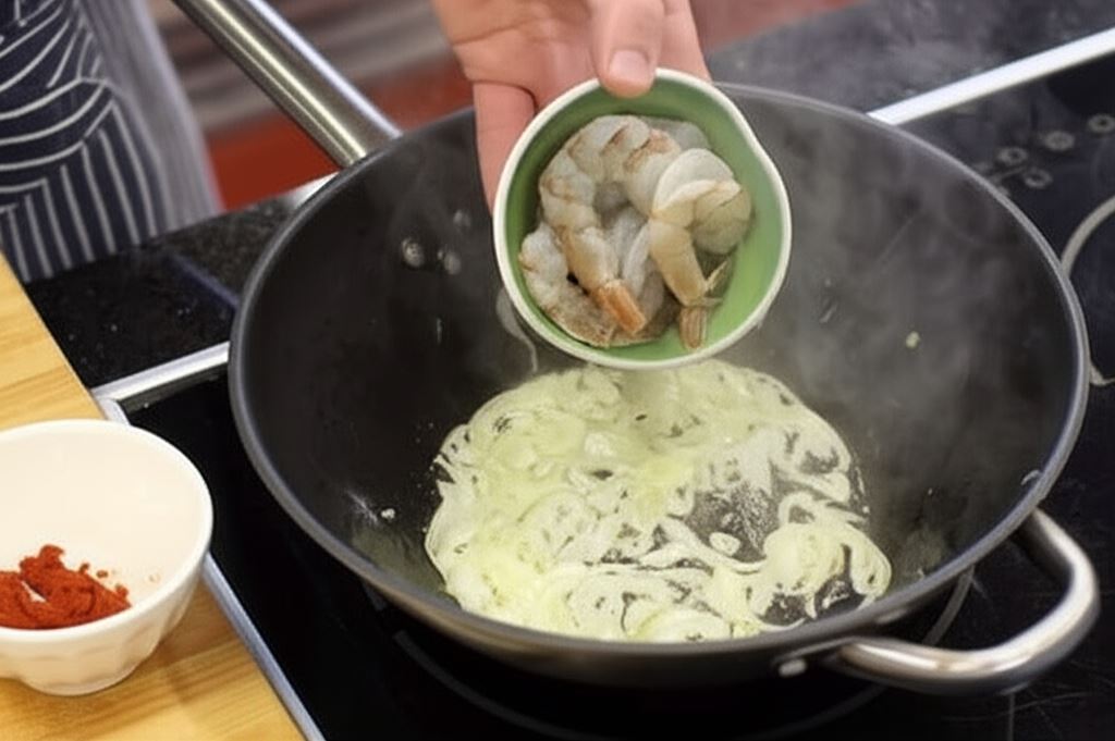 Rozgrzej olej w woku, podsmaż cebulę i czosnek, wsyp krewetki, dodaj pastę curry i smaż moment na intensywnym ogniu.