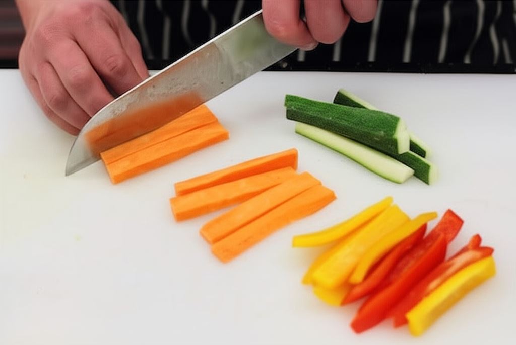 Świeżą cukinię opłucz, osusz i przekrój wzdłużnie na połówki, potem jeszcze raz na pół, a z otrzymanych ćwiartek wytnij fragmenty z nasionami. Zielone części potnij w paski o grubości 0,5 centymetra. Podobnie postąp z ziemniakiem. Umyte papryki przekrój, wydrąż gniazda nasienne i również pokrój w słupki.