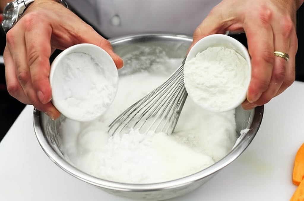 W misce ubij białka na sztywną pianę, dodaj wodę gazowaną, sól oraz obydwa typy mąki. Całość ostrożnie wymieszaj. Przygotowane ciasto powinno być lekkie i puszyste.
