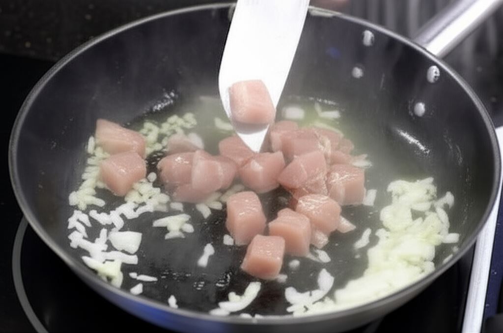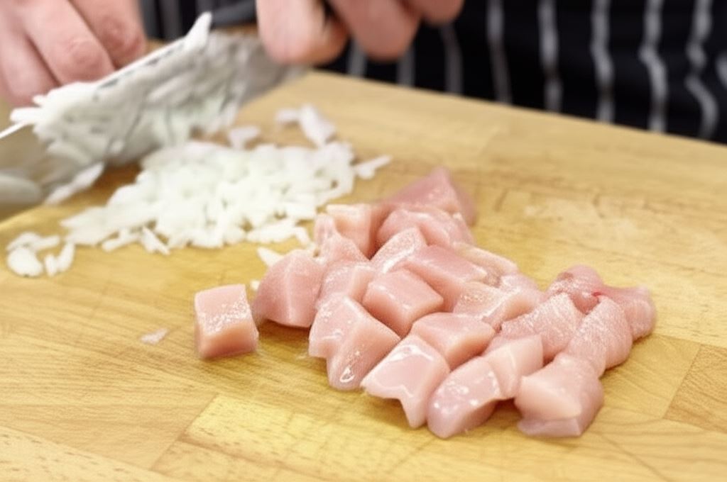 Mięso potnij w kostkę około 1 cm na 1 cm. Posiekaj cebulkę.