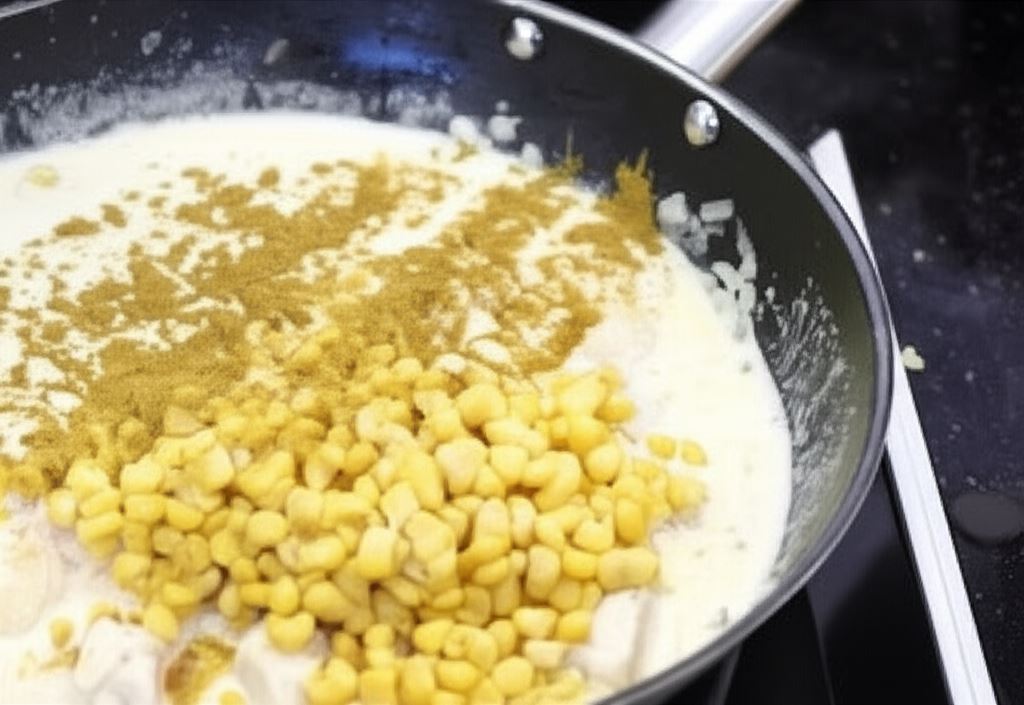 Wsyp kukurydzę, curry i wszystko gotuj około 5 minut, dopóki sos nie zgęstnieje. Usmażonego kurczaka serwuj najlepiej z ryżem.