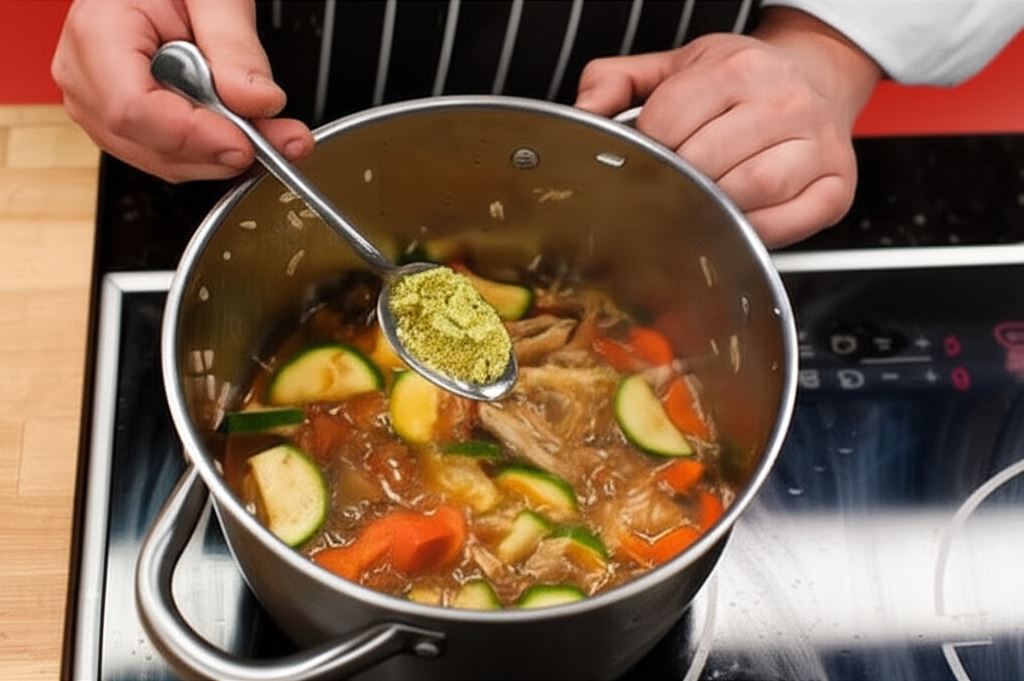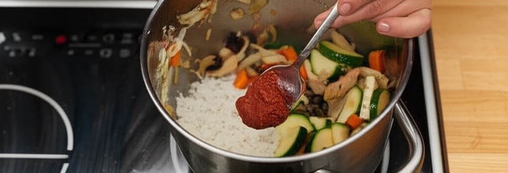 Zalej wszystko połową szklanki wody, wsyp Bulion na włoszczyźnie Knorr, starannie wymieszaj i duś przez około 15 minut.