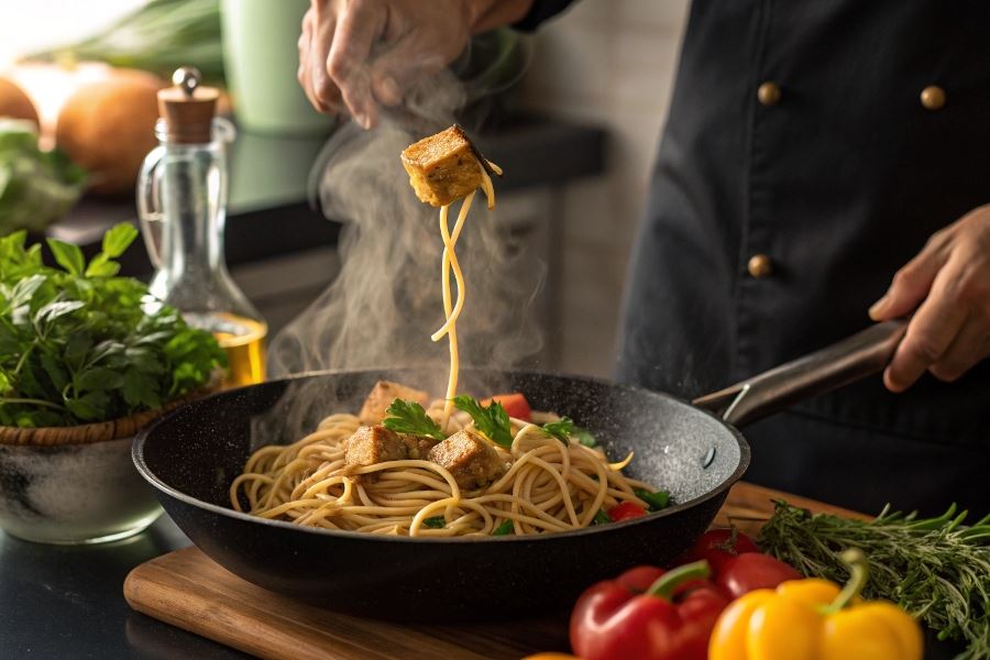 Spaghetti z wędzonym tofu to prawdziwa skarbnica wartościowych składników odżywczych. Wędzone tofu dostarcza 16-20 g białka roślinnego na 100 g produktu, co czyni je doskonałym zamiennikiem mięsa w diecie wegańskiej. Zawiera również komplet aminokwasów egzogennych, których organizm nie potrafi sam wytworzyć. Dodatkowo jest źródłem: