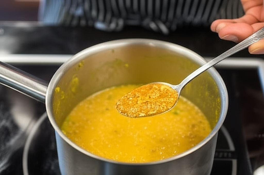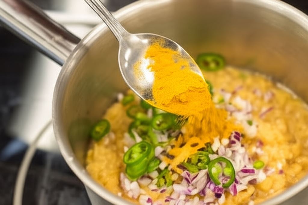 Kiedy soczewica stanie się prawie miękka, dodaj pokrojoną w kostkę cebulę, kurkumę w proszku oraz pokrojoną w plasterki papryczkę chili.