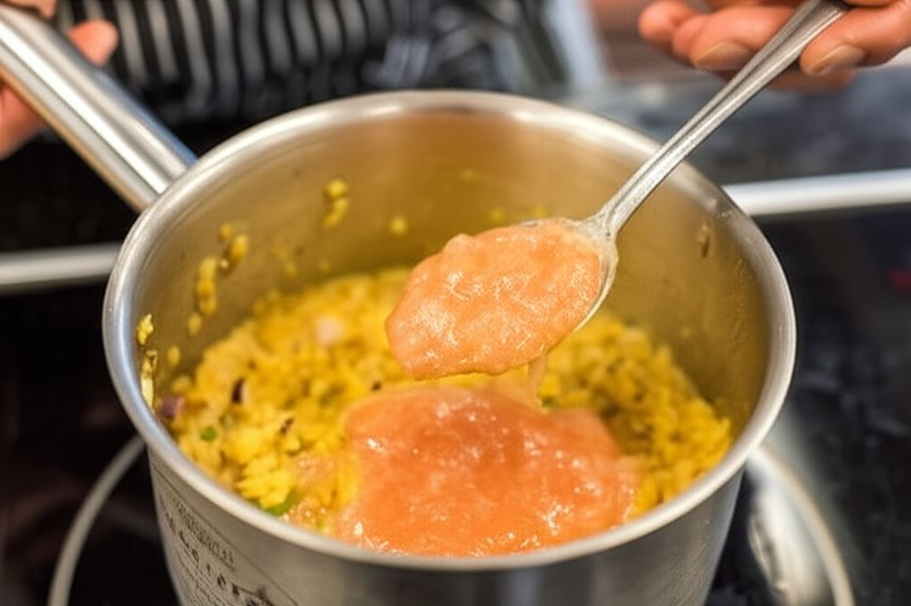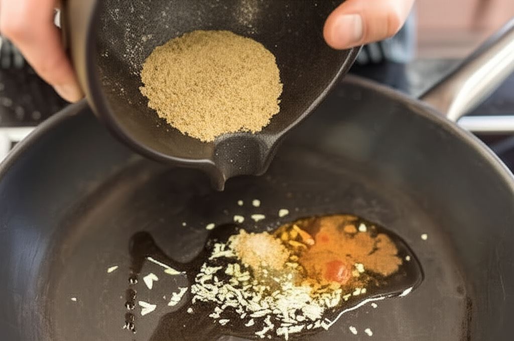 Rozgrzej tłuszcz na patelni, wsyp posiekany czosnek, proszek chili, kmin, rozgniecione ziarna gorczycy oraz liście curry. Smaż przez kilkadziesiąt sekund, cały czas mieszając.