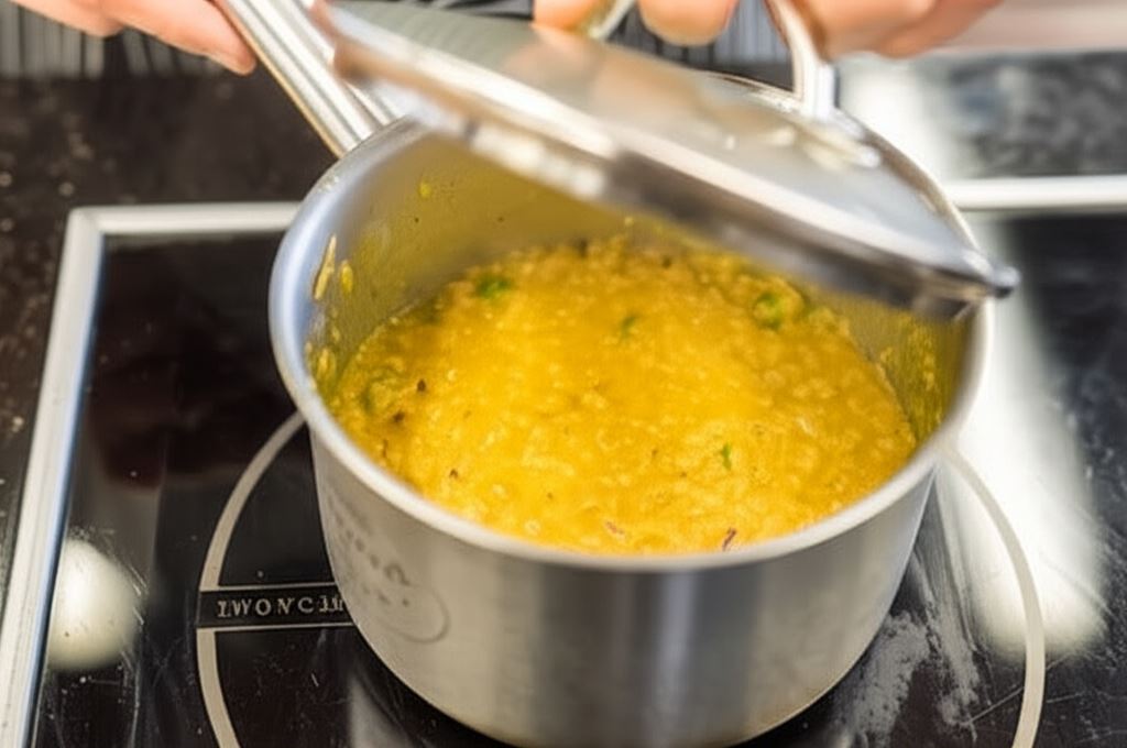 Gotuj dopóki soczewica prawie całkowicie się rozpadnie, a woda niemal zupełnie odparuje. Następnie przykryj i odstaw.