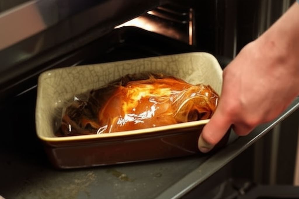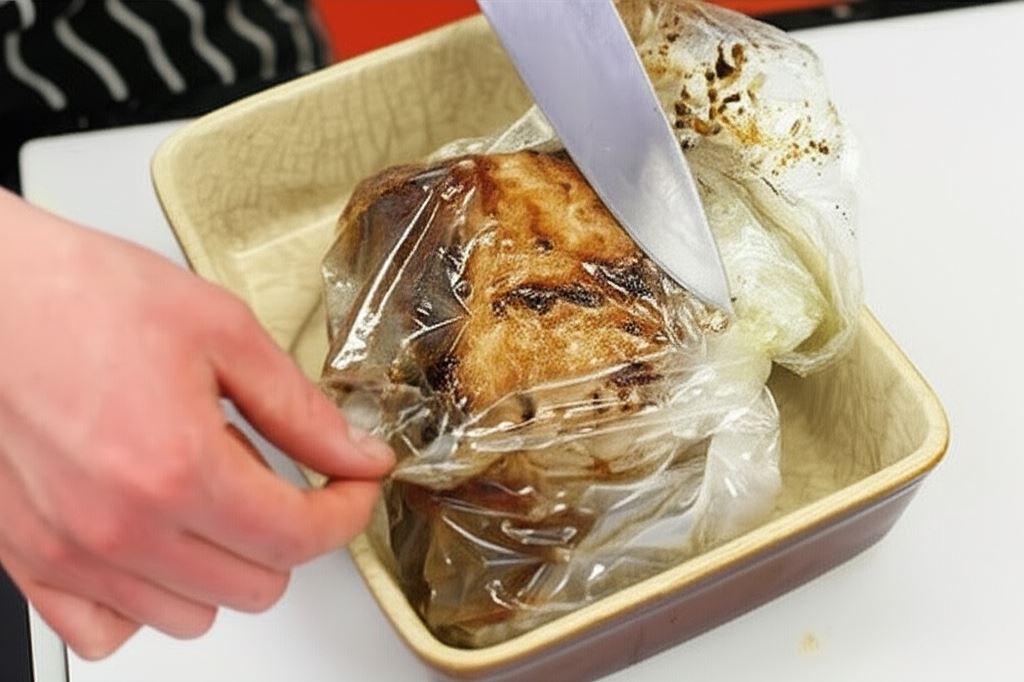 Jeżeli pragniesz, by karkówka pieczona w piekarniku posiadała bardziej chrupiącą skórkę, przetnij rękaw (uważaj na gorącą parę) na 15 minut przed zakończeniem pieczenia.