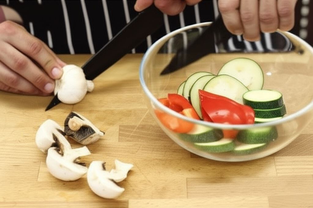 Opłucz wszystkie warzywa. Z papryki wyciągnij nasiona, bakłażana i cukinię potnij w plastry, a pieczarki przekrój na połówki.