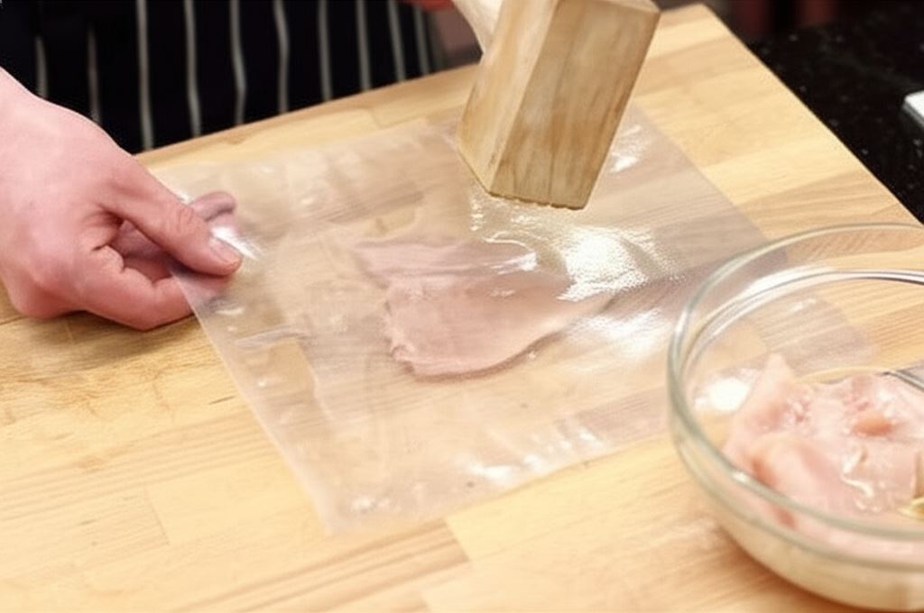 Przygotuj 4 porcje mięsa. Lekko rozbij je tłuczkiem i połącz w marynacie.