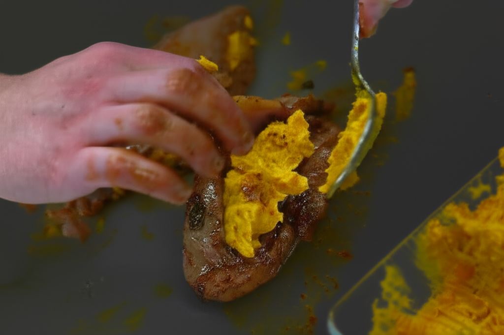 Upieczoną dynię zblenduj starannie z miodem, żółtkami, imbirem, cynamonem i bułką tartą. Powinna utworzyć się dość zwarta masa. Nadzienie włóż w nacięcie piersi kurczaka.