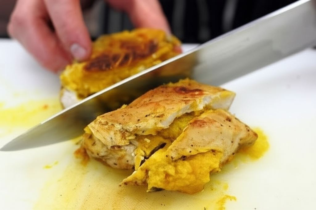 Filety z kurczaka opłucz i pozbądź się błonek. Pośrodku, rozpoczynając od grubszej części, wykonaj nacięcie na całej długości. Mięso delikatnie roztłucz do grubości około 2 cm, dbając, by nie przeciąć filetu. Roztłuczone piersi włóż do przygotowanej marynaty.