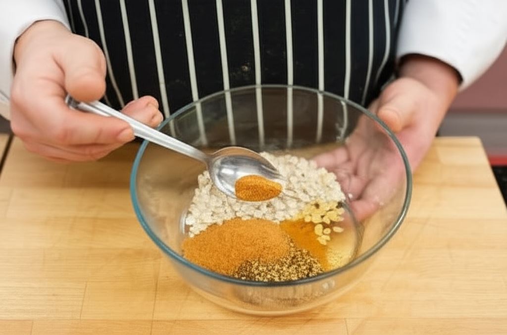 Przyprawę Knorr połącz z miodem, płatkami i musztardą. Jeżeli preferujesz pikantne dania, dodaj również łyżkę octu winnego i pół łyżeczki ostrej papryki.
