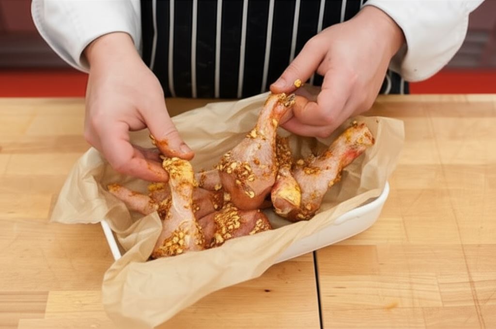 Sekret idealnie chrupiącej skórki tkwi w odpowiednim połączeniu miodu z przyprawami oraz w technice pieczenia. Najpierw pod przykryciem, by mięso pozostało soczyste, a następnie bez przykrycia, by skórka nabrała apetycznej chrupkości. Papier do pieczenia zapobiega przypaleniu się miodu, dzięki czemu glazura pozostaje karmelizowana, a nie gorzka.