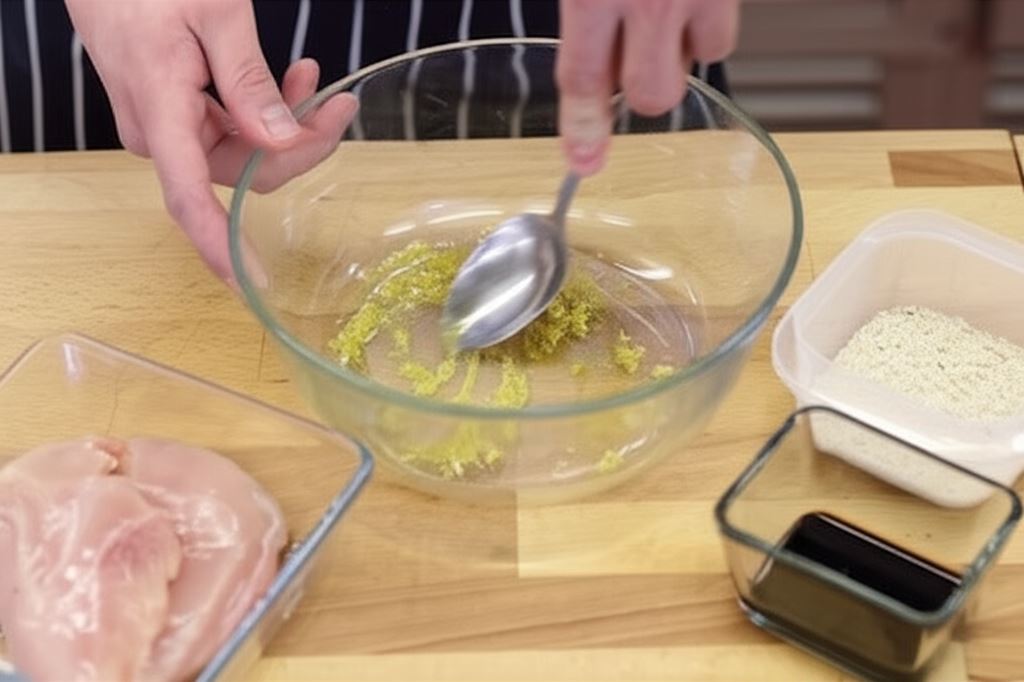 Wymieszaj kostkę rosołową z 3 łyżkami oleju, łyżką sezamu, łyżką sosu sojowego i odrobiną imbiru. Powstałą marynatą posmaruj podwójną pierś kurczaka.