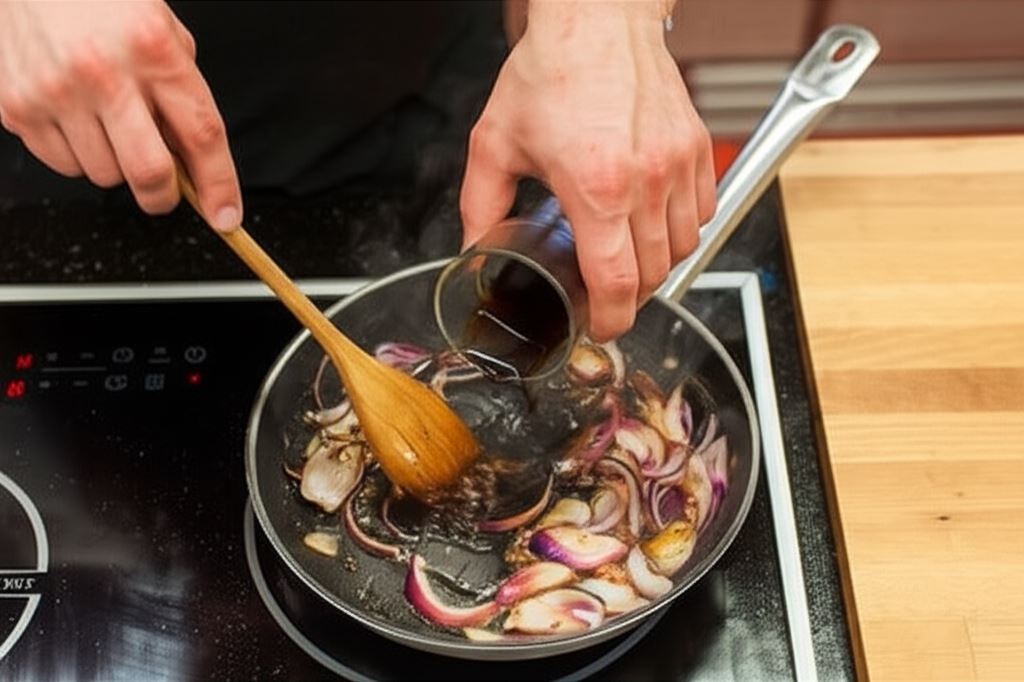 W tym czasie przygotuj konfiturę z cebuli. Na patelni skarmelizuj cukier. Powinien być delikatnie brązowy. Do cukru wsyp goździki, cynamon i cebulę. Całość smaż moment, następnie dodaj ocet i sok porzeczkowy. Wszystko razem gotuj około 20 minut na silnym ogniu, aby płyn całkowicie odparował. Na końcu dodaj łyżkę masła i wszystko wymieszaj.