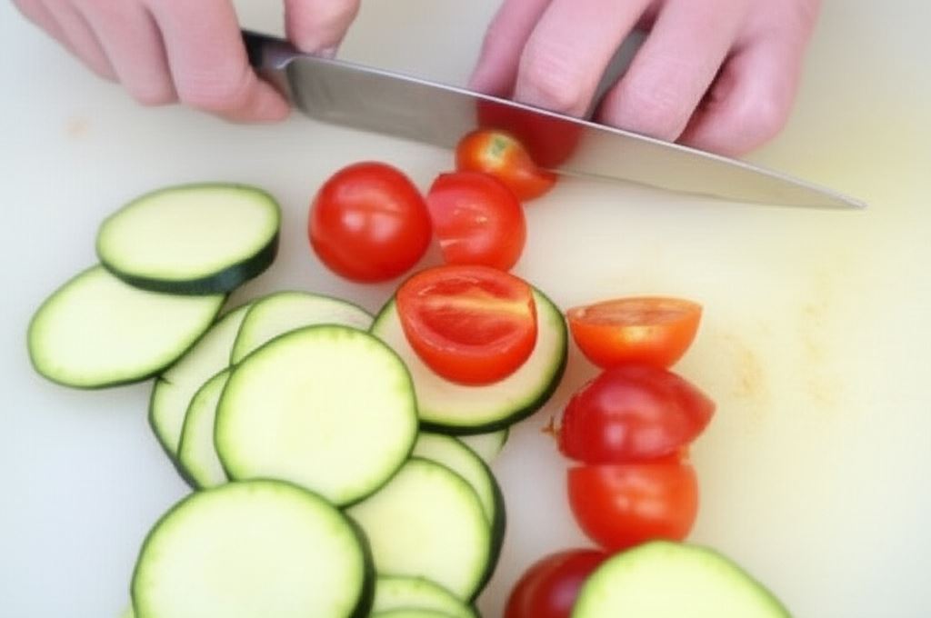 Cukinię pokrój na cienkie krążki. Pomidorki przekrój na połówki.