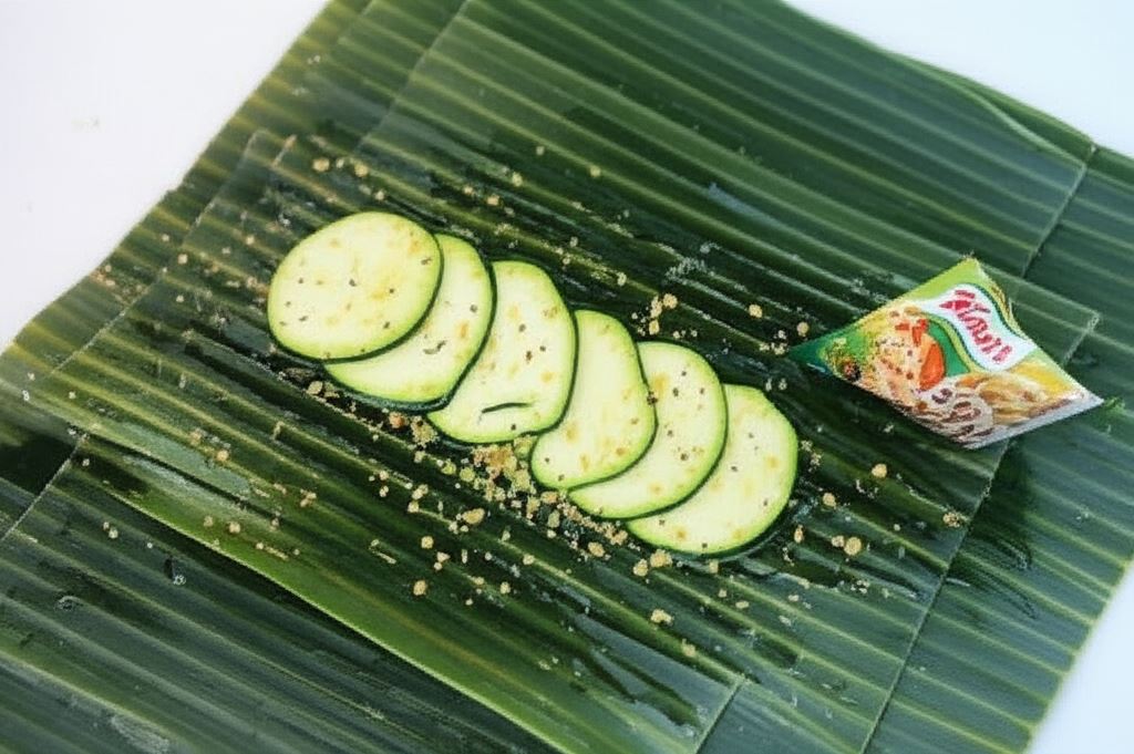 Na rozłożone liście bananowca umieść kilka plasterków cukinii. Potem skrop je oliwą i posyp przyprawą Knorr.