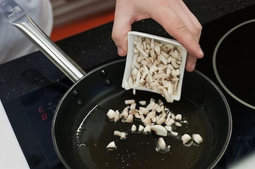 Na rozgrzanym maśle zrumień rozmrożone podgrzybki i cebulkę. Trzeba pilnować, aby masło nie przypaliło się, bo inaczej danie będzie niesmaczne i szkodliwe. Potem wrzuć je do bulionu z warzywami i duś przez około 15 minut.