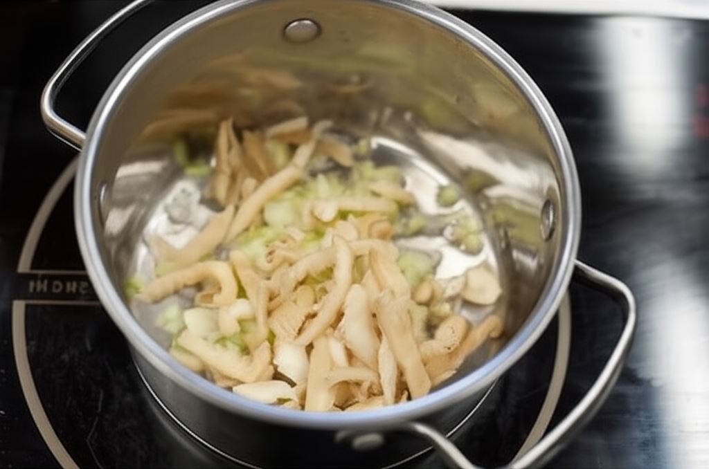 Na patelni lub w garnku, w którym było przygotowywane mięso, zrumień na gorącym tłuszczu drobno posiekaną w kostkę cebulę oraz grzyby pokrojone w plastry.
