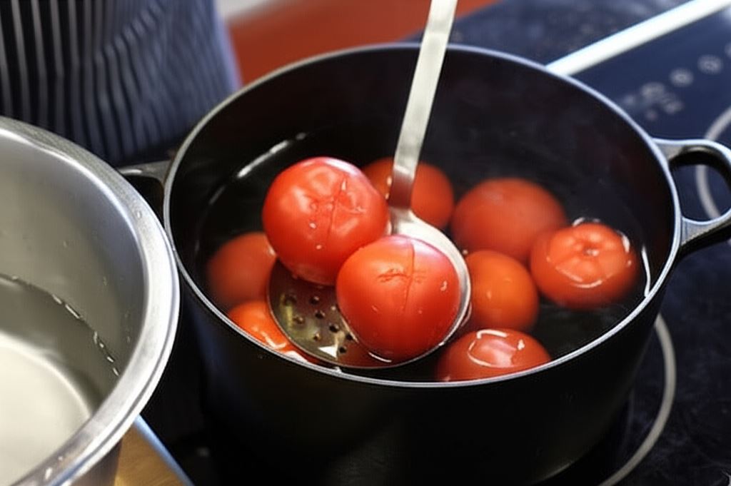 Pomidory umieść w naczyniu i zalej wrzątkiem. Po paru minutach wyjmij z wody, przestudzić i zdejmij skórkę.