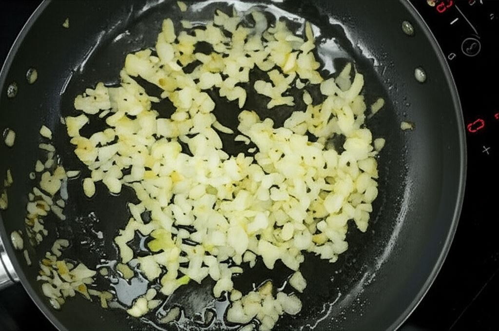 Rozgrzej oliwę na patelni albo w płytkim garnku, przesmaż na niej posiekany czosnek i pokrojoną w kostkę cebulę do zeszklenia.