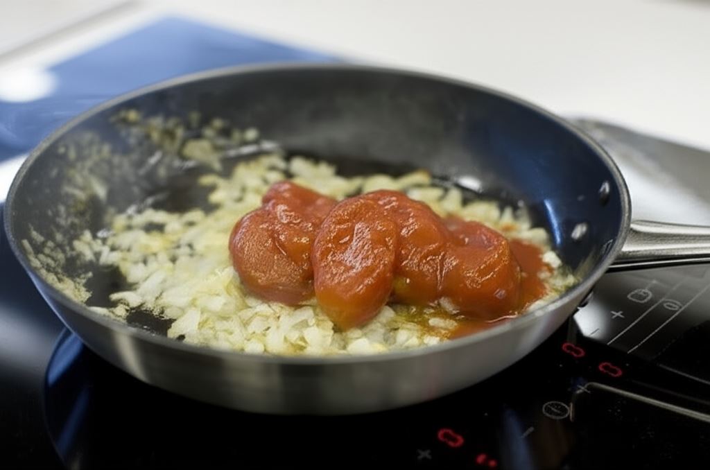 Wsyp pokruszone pomidory i całość gotuj przez około 20 minut nieustannie mieszając, aż woda wyparuje.