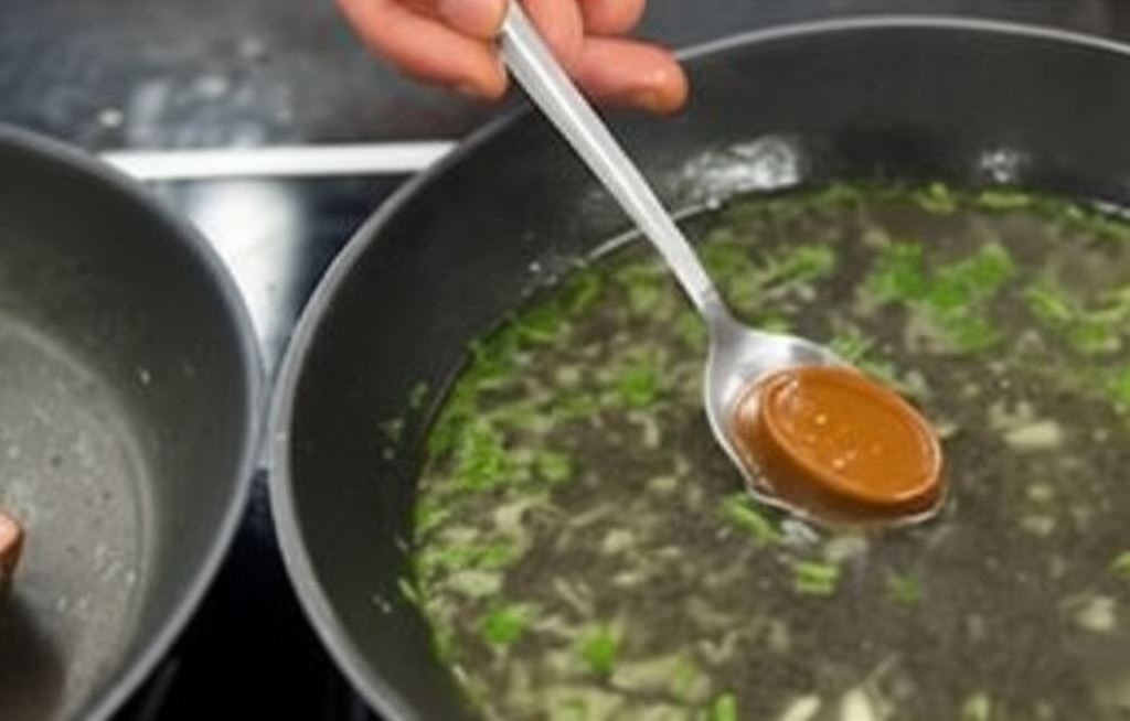 Wsyp posiekane zioła, dolej 200 ml ciepłej wody. Zdejmij patelnię z ognia, wsyp Sos do pieczeni ciemny Knorr, który sprawi, że sos nabierze gęstości i odpowiedniego smaku. Dokładnie wymieszaj całość. Gotuj wszystko razem przez 2 minuty.
