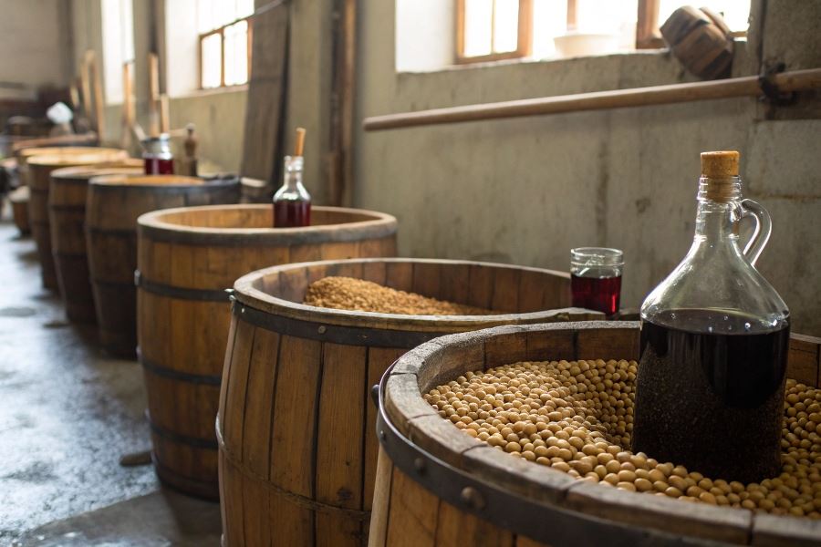 W japońskiej metodzie tradycyjnej shoyu fermentacja przebiega w cedrowych kadziach, gdzie mikroorganizmy powoli przekształcają białka i węglowodany w aminokwasy i cukry proste, nadając sosowi charakterystyczny umami.