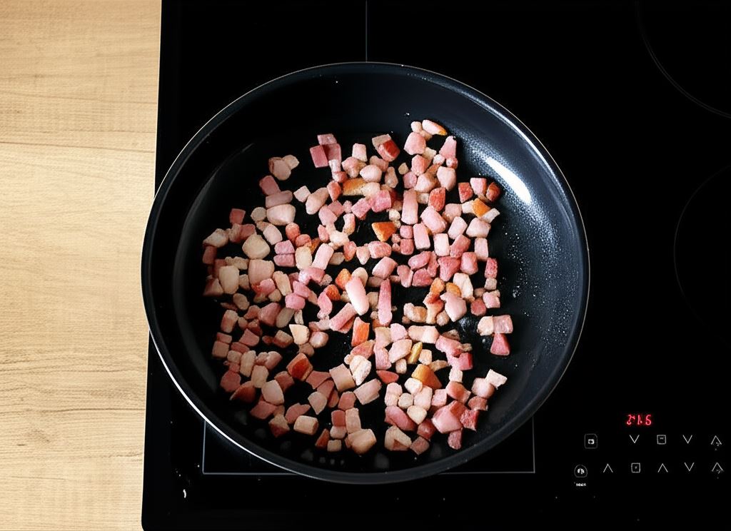 Podgrzej na patelni 1-2 łyżki oleju, a kiedy będzie już gorąca, dodaj na nią pokrojony w kostkę chudy boczek. Smaż go przez kilka minut, aż stanie się lekko kruchy. Dla pewności możesz nakłuć kawałek widelcem i spróbować, czy taki stopień wysmażenia ci pasuje. Potem zdejmij patelnię z ognia.